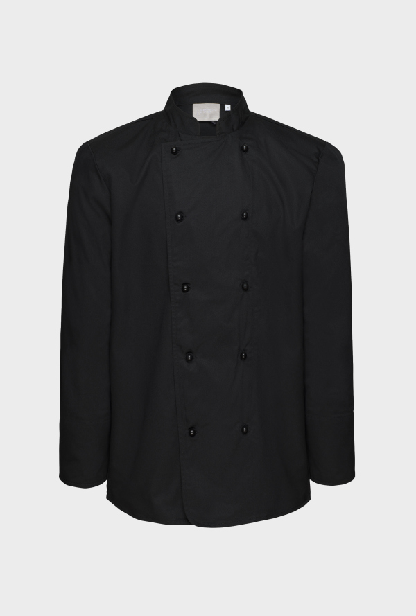 Carl is a black chefs jacket in durable cottonmix from Ted Bernhardtz At Work. The chefs jacket is a double breasted with a classic fit in a durable twill fabric. The chefs jacket has sleeve slits and removable chefs buttons in plastic and can be buttoned in both directions.