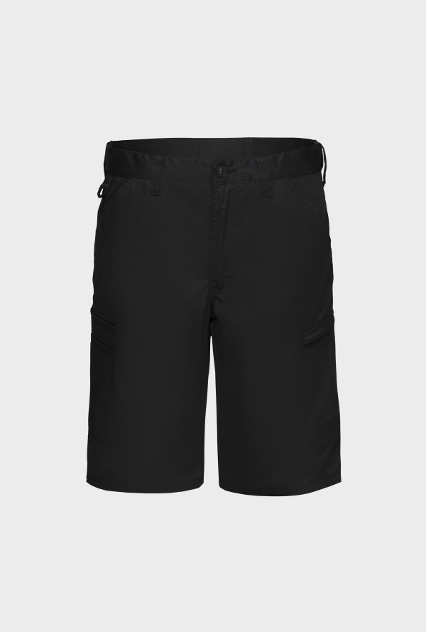 Joel är ett par serviceshorts med benfickor i bomullsmix från Ted Bernhardtz At Work. Shortsen har en normal passform i slitstark twill perfekt för inomhusbruk. Shortsen har en metallknapp framtill, D-ring i linningen på höger sida och ok bak för bättre passform. Shortsen har två sidofickor fram, en integrerad benficka med dragkedja på vänster sida, både integrerad benficka och pennficka på höger sida samt två fickor med lock och kardborreknäppning i oket bak.