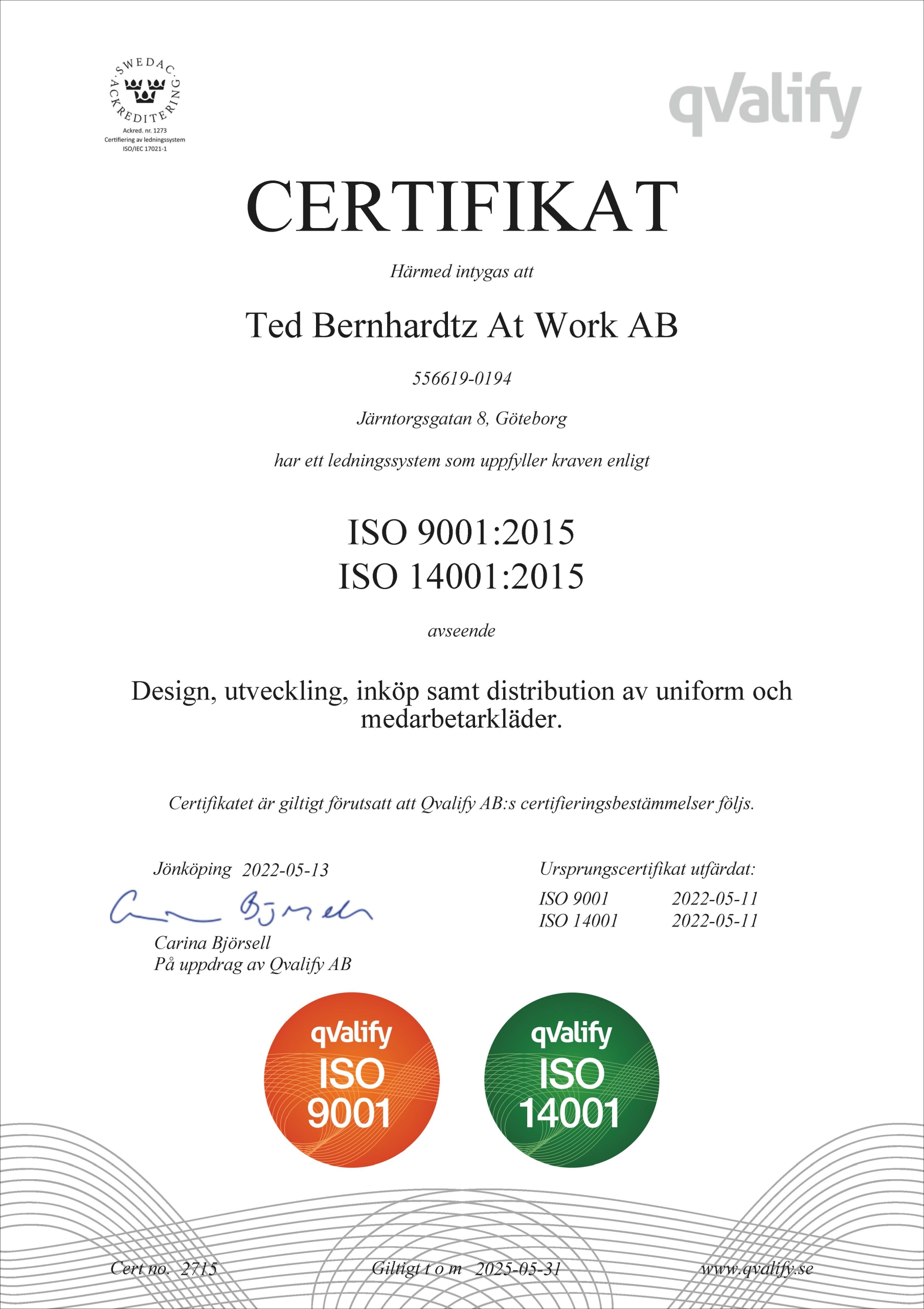 Ted Bernhardtz At Work har ett ledningssystem som uppfyller kraven enligt: